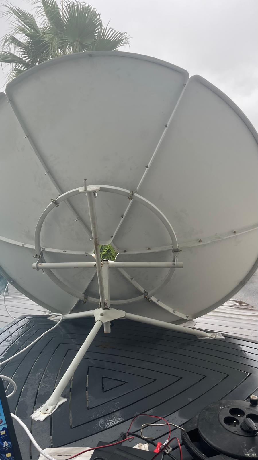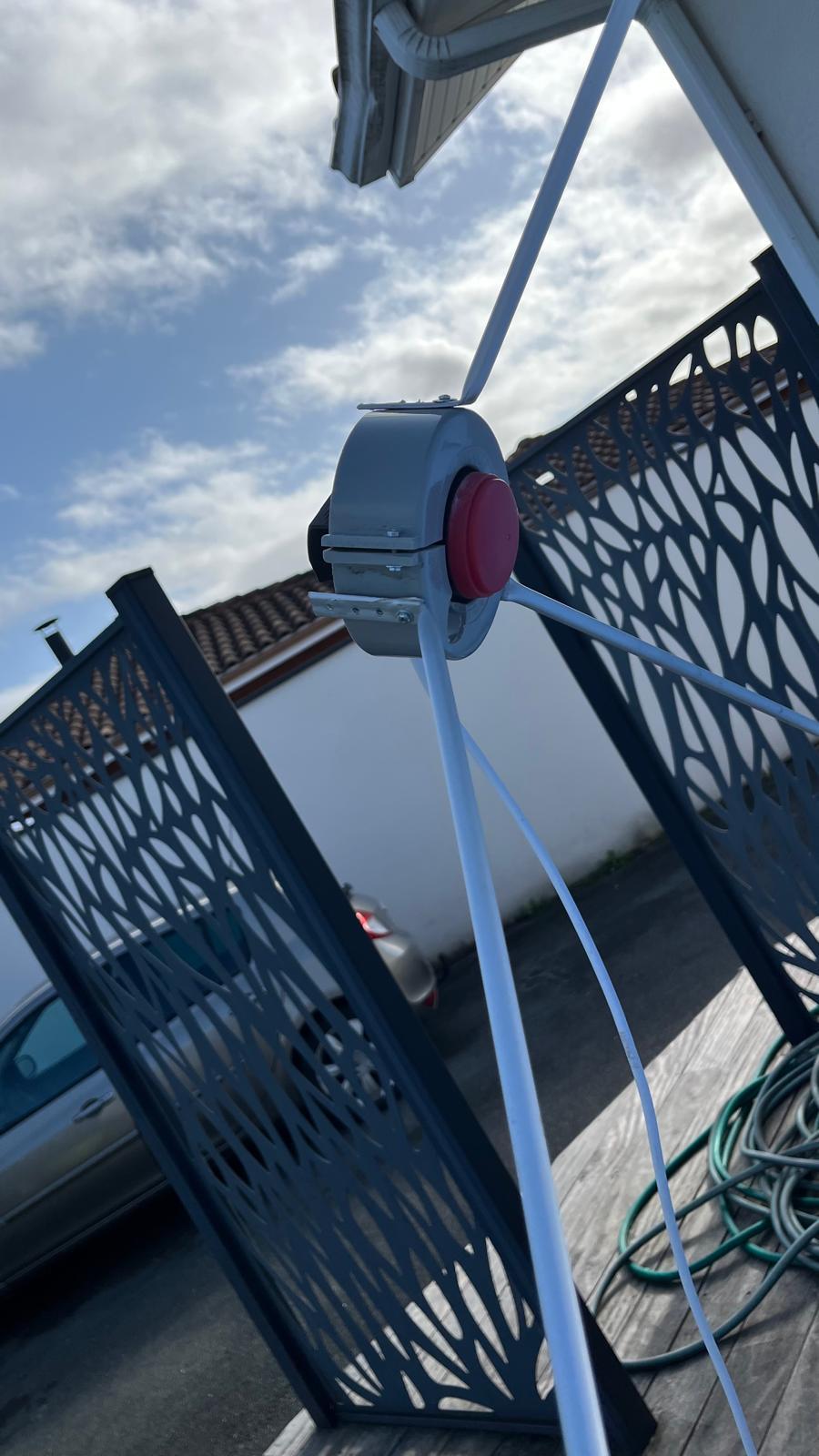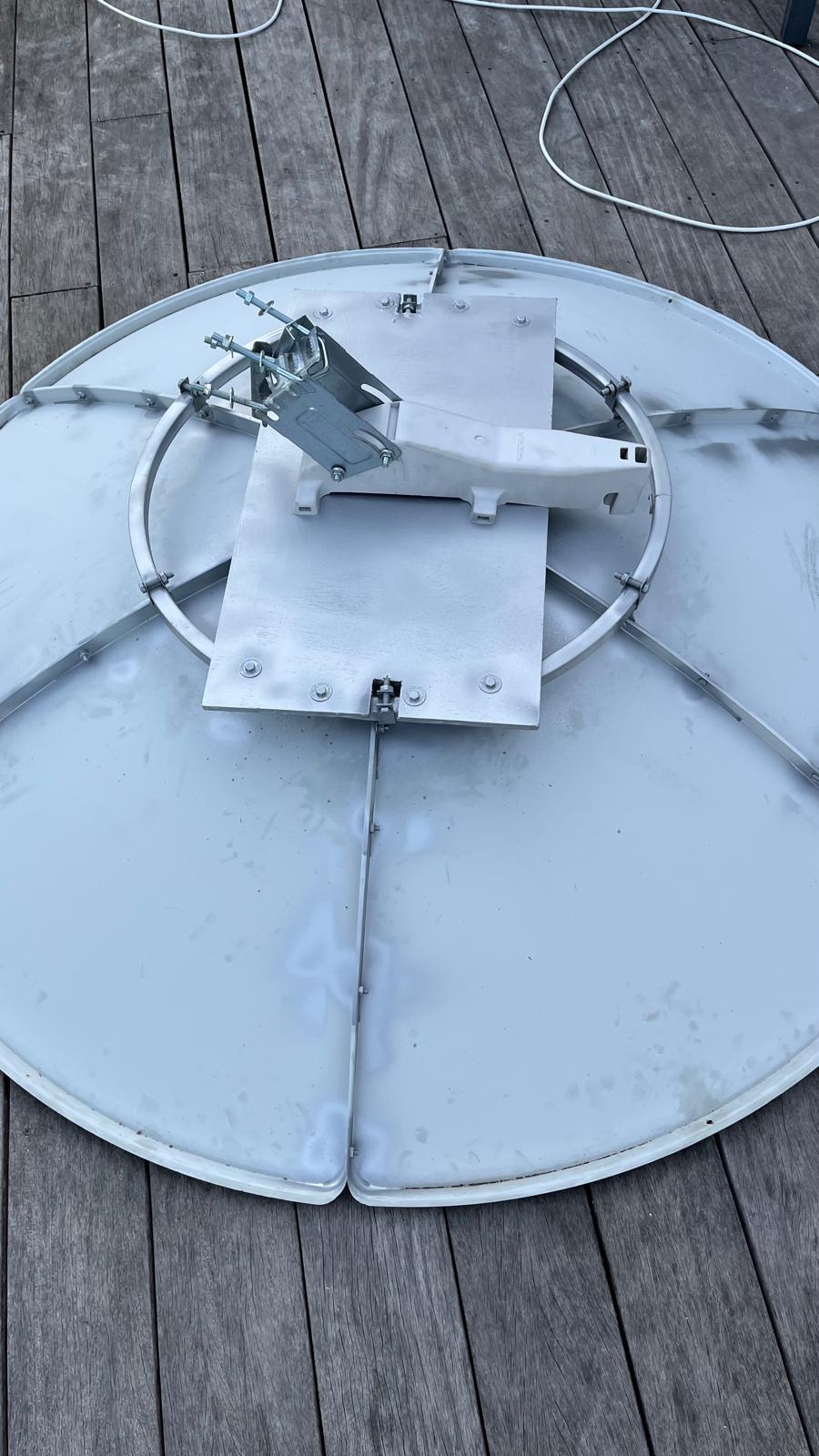 Le support de l’antenne, à l’origine un trépied, ne convient pas à notre utilisation. Je l’ai confectionné à partir de celui récupéré sur une antenne offset et d’une plaque de contreplaqué marine fixée sur la couronne arrière de l’antenne .