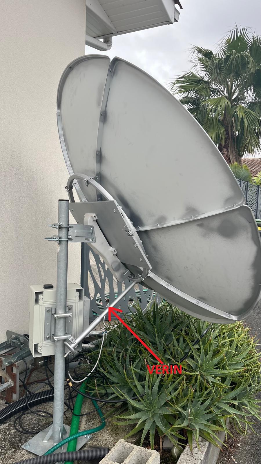 Compte tenu des masses et inerties mises en jeu, un vérin (tige filetée) contribue au réglage et au soutien de l’ensemble, facilitant grandement la stabilité du pointage de l’antenne, relativement critique eu égard au faible angle d’ouverture.